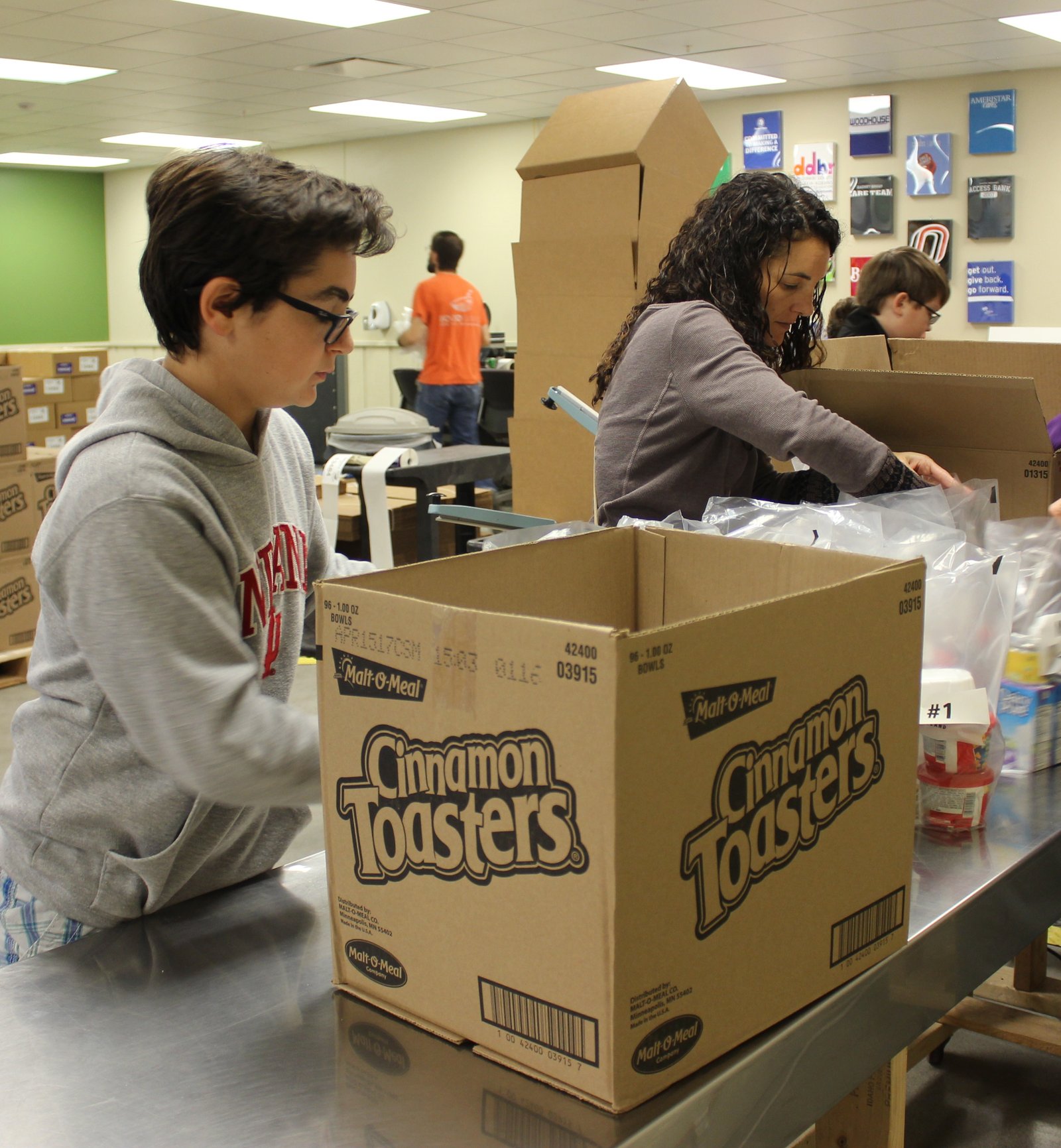 After learning about hunger and the important programs available to help those in need, youth and their parents and grandparents volunteered, helping assemble items for the Backpack program. This program serves chronically hungry students at local elementary schools. The Backpack program supplies packs filled with healthy food to children to take home on Friday afternoons, so that they can have food over the weekend. The Food Bank for the Heartland currently distributes 8,400 packs to children in need each week. As part of the day’s program, Youth in Philanthropy participants assembled 224 food packs.